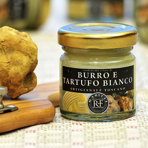 Delicate butter enriched with Tuscan White truffle slices; ready to use, it is ideal for appetizers, first and second courses. No preservatives / no colorant. 30gr - 250gr